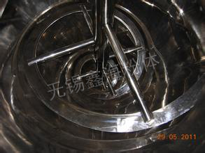 由于螺帶的自轉而使粉體沿著錐體壁作圓周運動。螺旋葉片的自轉,使粉體向錐體中央排放作徑向運動。粉體自錐體向上升流及螺旋外圓周表面上排出,即螺旋軸方向混合。螺旋在混合機內自轉的組合,造成了粉體的四種流動形式,也就是對流,剪切,擴散,滲合的復合運動。因此粉體物料在這種混合機內能迅速達到均勻的混合。